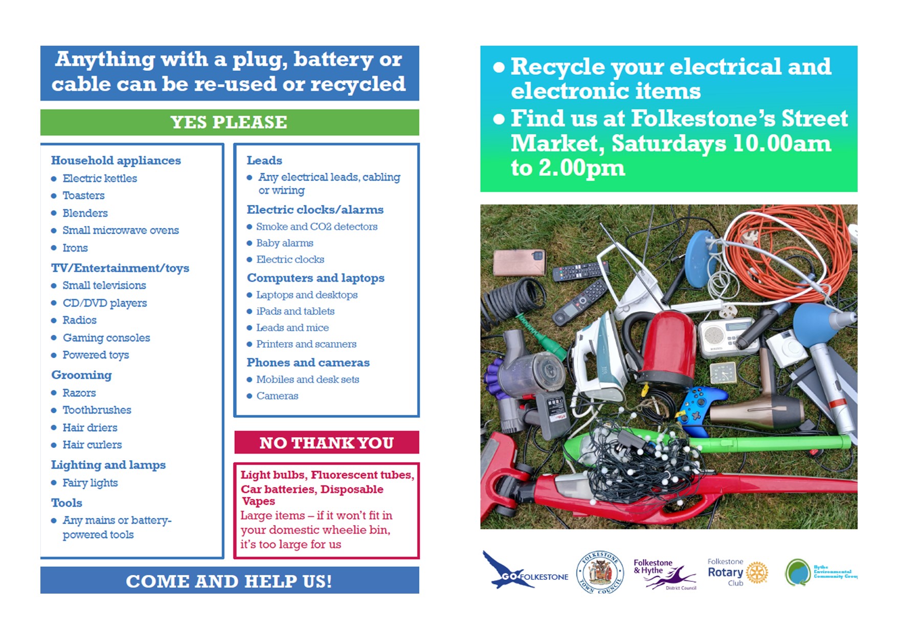 If you don’t wish to volunteer maybe you would like to do some Spring cleaning in the Autumn? Small defunct household items, leads, cabling, wiring – all items on the flyer below much appreciated. These items will be taken to Sittingbourne where they will be stripped and recycled, not turned into more landfill!
